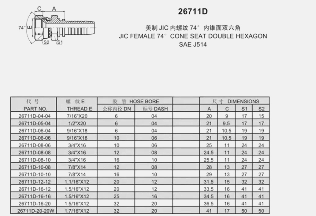 Zhejiang Tianxiang Machine Fittings Co., Ltd. Thuis / Producten / Hydraulische slangkoppelingen / Amerika hydraulische slangkoppelingen / Jic vrouwelijke dubbele zeshoek met 74 kegel